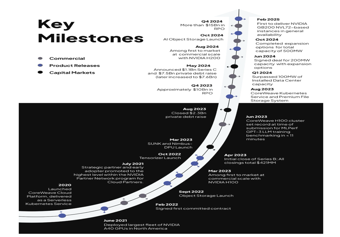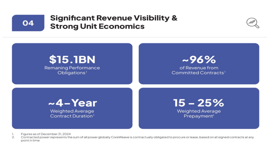 - CoreWeave has secured substantial long-term (typically 2 to 5 years, weighted average of 4 years), take-or-pay contracts with major customers, providing revenue visibility and stability. They have $15.1 billion in Remaining Performance Obligations at year-end 2024 which grew 53% year over year.