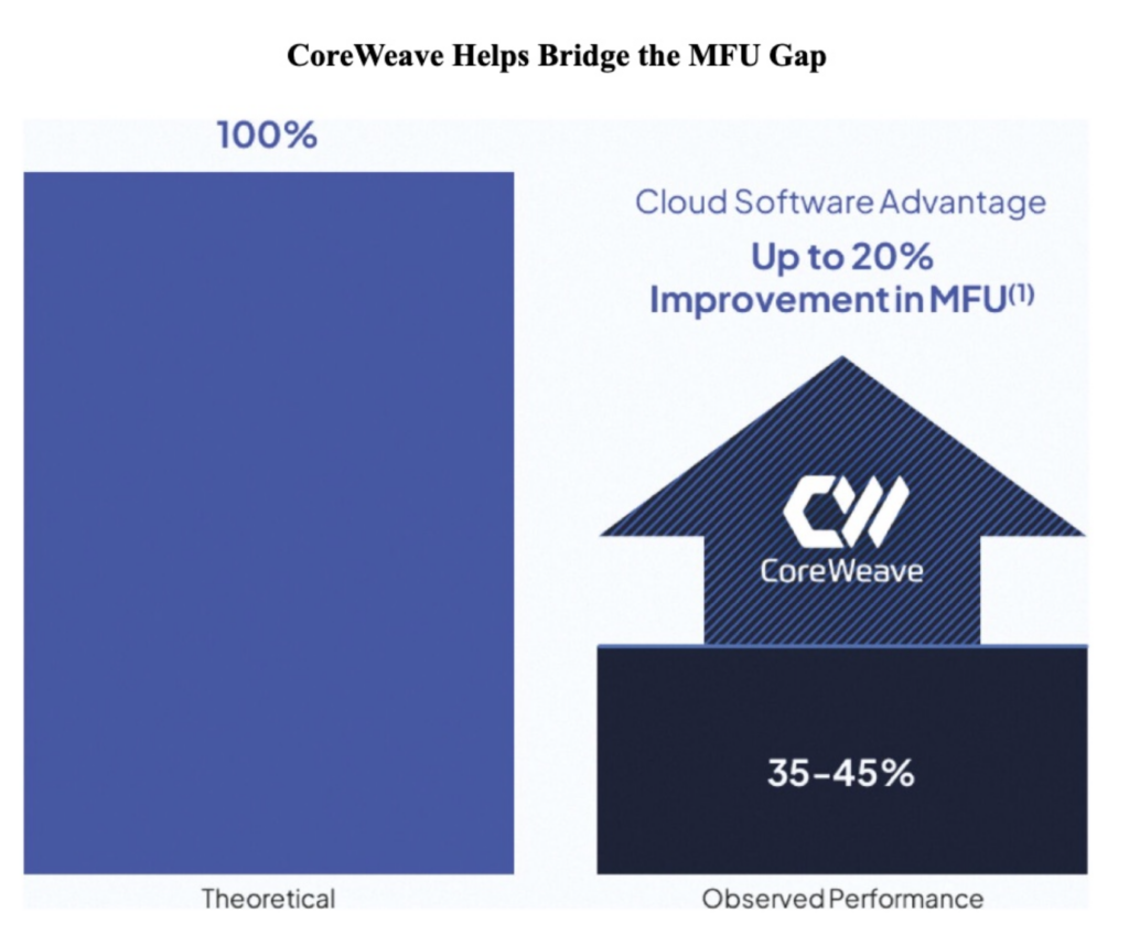 - CoreWeave was purpose-built for the AI cloud. They cite 8- 10x faster container spin-up times vs. the general CSPs and 3- 5x faster download speeds. They claim to address the MFU “Efficiency Gap” far better than general Cloud Service Providers (i.e., AWS, GCP, Azure). The MFU Efficiency Gap refers to the large loss of compute capacity from GPUs due to system efficiencies. (see their table below)