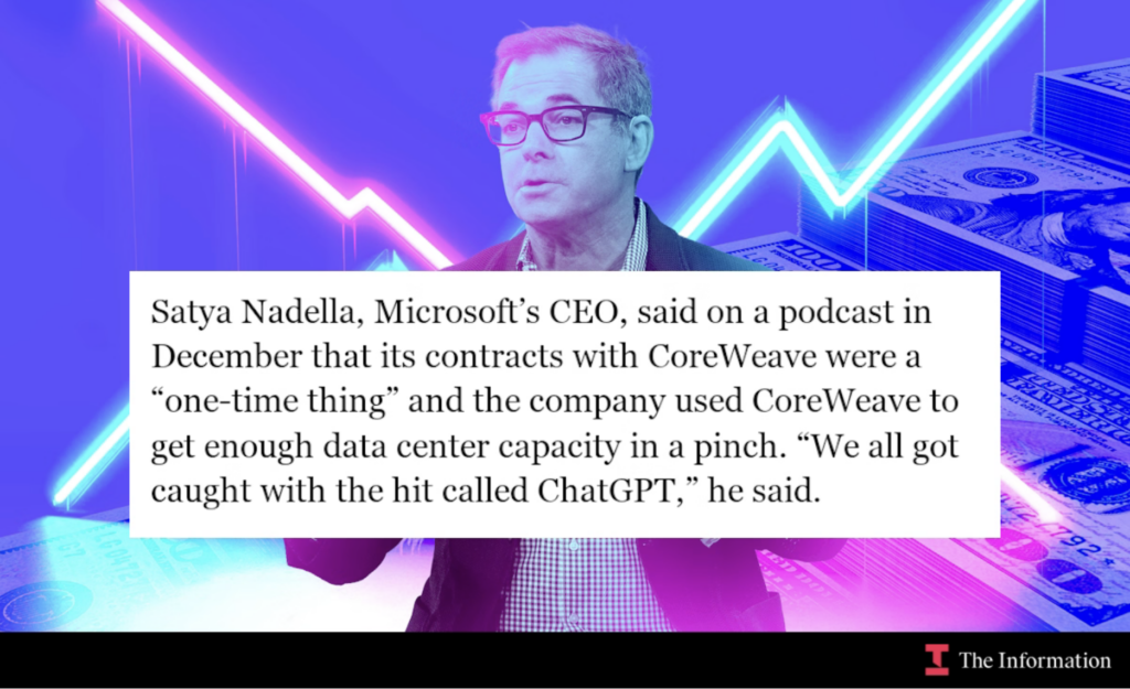 - CoreWeave’s revenue dependency on Microsoft (MSFT) has skyrocketed to 62% in 2024, up from 35% in 2023 and just 16% in 2022. This dramatic increase coincides with the surge in demand for Nvidia GPUs driven by the ChatGPT boom. However, Microsoft CEO Satya Nadella has downplayed long-term exclusivity, calling it a “one-time thing” in a podcast interview cited by The Information. CoreWeave’s revenue could be severely impacted if Microsoft shifts its AI strategy.