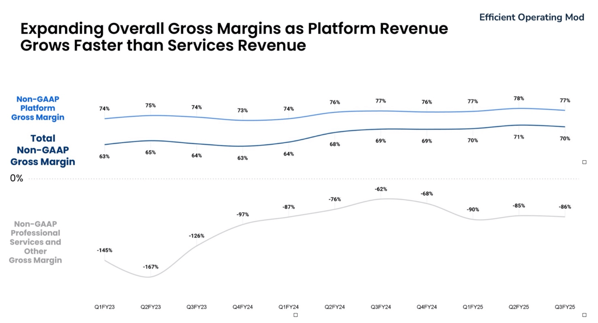 ServiceTitan’s (TTAN) first quarter as a public company combined the positives and negatives previewed on their IPO roadshow in December. Positives include Net Dollar Retention (NDR) exceeding 110% for the 11th consecutive quarter, Gross Dollar Retention (GDR) over 95%, and slight platform revenue acceleration to 26% (vs. 25% FQ2). Cautionary data points: elevated costs in S&M 28% (Long-Term target 18-20%), R&D 27% (Long-Term target 20-22%), continued losses in Professional Services -86% margin creating a meager 1% Operating Margin (Long-term target 25%).