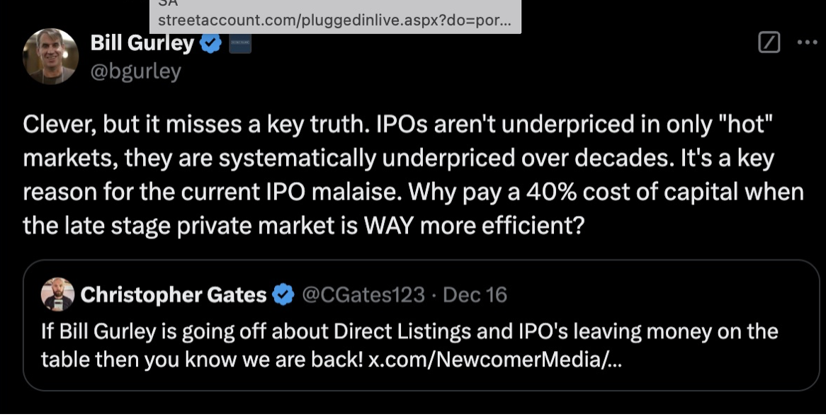 The rule of thumb is a 10-20% increase in the IPO price is ideal as it rewards investors in the IPO but does not leave too much money on the table. Pricing the deal at $71 and seeing over a 40% increase as it opened, cost the company $264 million in lost proceeds (e,g, $101 less $71 IPO price times 8.8 million shares sold to the public). Bill Gurley, the famous Benchmark VC investor advocates for a direct listing where a company avoids investment banks and sells shares directly to investors. I would strongly concur, as you avoid investment banking fees and get more of a true market price versus rewarding the investment banks’ top customers.