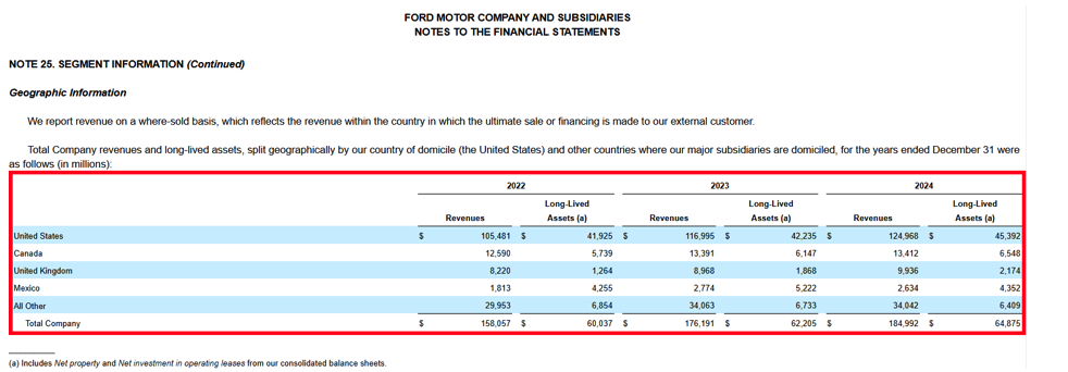 For the year 2024, Ford’s total company revenues were $185b, with the United States contributing $125b, Canada $13.4b, the United Kingdom $10b, Mexico $2.6b, and all other countries $34b. Additionally, the total long-lived assets for the company were $64.875 billion, with the United States having $45.392 billion, Canada $6.548 billion, the United Kingdom $2.174 billion, Mexico $4.352 billion, and all other countries $6.409 billion. These numbers can be found in this table.