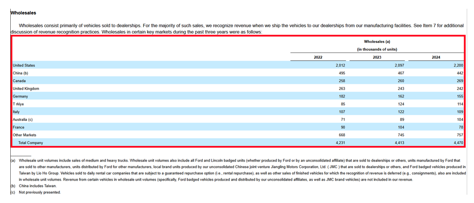 Moreover, Ford’s total wholesales in 2024 were 4.4m units, with the United States accounting for 2.2m units, China 0.4m units, Canada 0.27m units, the United Kingdom 0.24m units, and other markets 0.76 thousand units. These figures are detailed in this table.