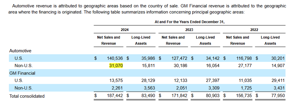 GM discloses data for that North America segment (GMNA), and international segment (GMI). 18% of auto sales come internationally but 30% of long-lived assets for GM auto sits outside of NA. See source table here. Of that, 12% of long-lived assets come from Mexico.