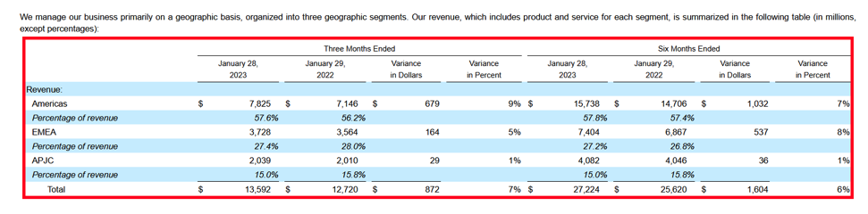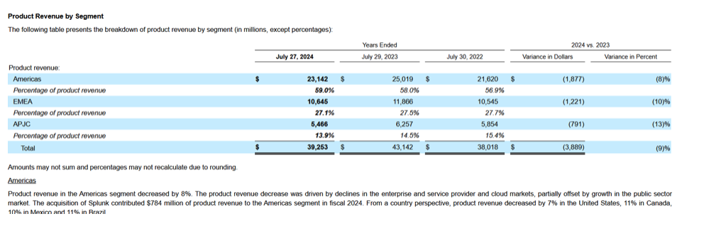 Cisco discloses product revenue by regions, while they do not disclose the relative scale of Mexico and Canada, there is some data in the footnotes that can help with estimates.