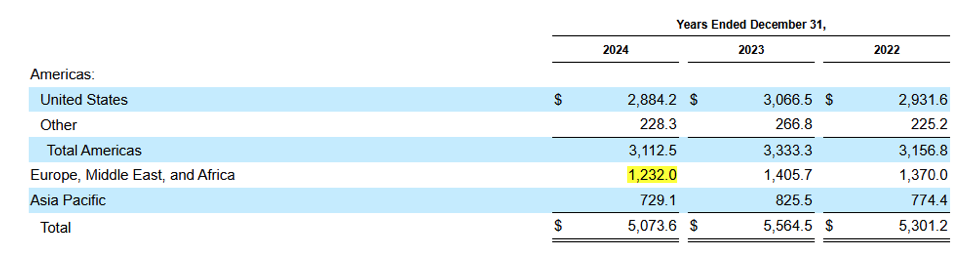 JNPR provides clear breakdown of the revenue from Mexico and Canada of 228.3m in 2024, making up 4.5% of revenue.