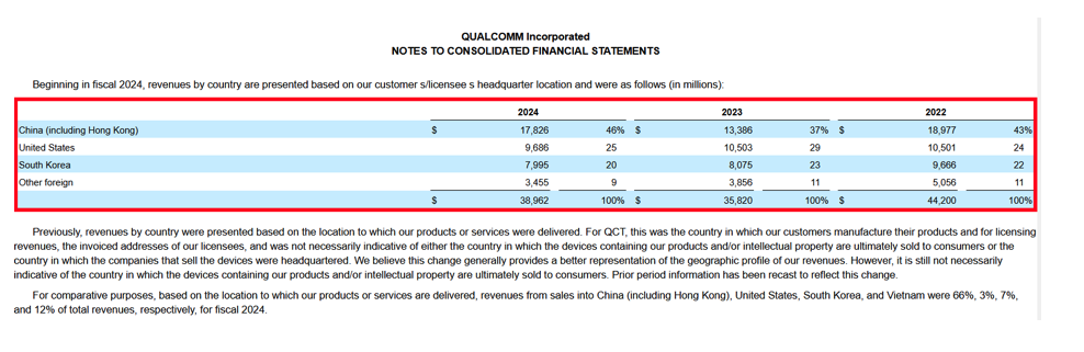Qualcomm’s major revenue country is China, at 46% of total (up from 37%). Note that in the footnotes, QCOM calls out an increased exposure to China when measuring revenue based on the location where the end product is being sold (66% instead of 46%).