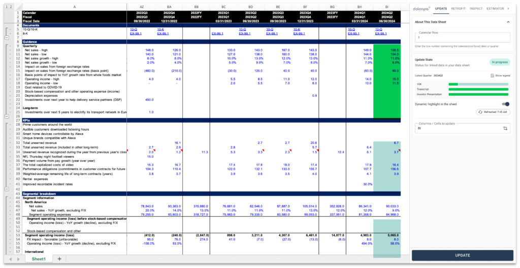 If you are a Daloopa Plus user, you’ll now see the Data Update Status feature now in your model when the Excel Add-in is launched. You’ll see that the Update tab’s design has been enhanced to accommodate this new feature and make it easier for you to view which stage the data is in and how long it will take to be ready.