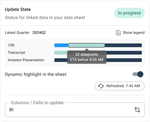 No more guessing when your next update will arrive. For each data source—such as 10K filings or transcripts—you’ll see a progress bar with an ETA for the next stage of data availability. This added transparency means you can plan your model updates around real, reliable timelines.
